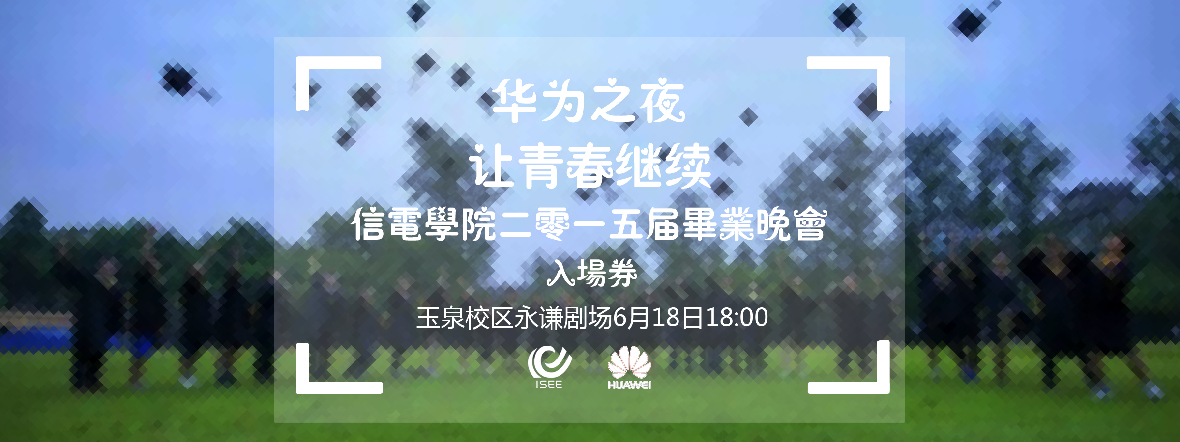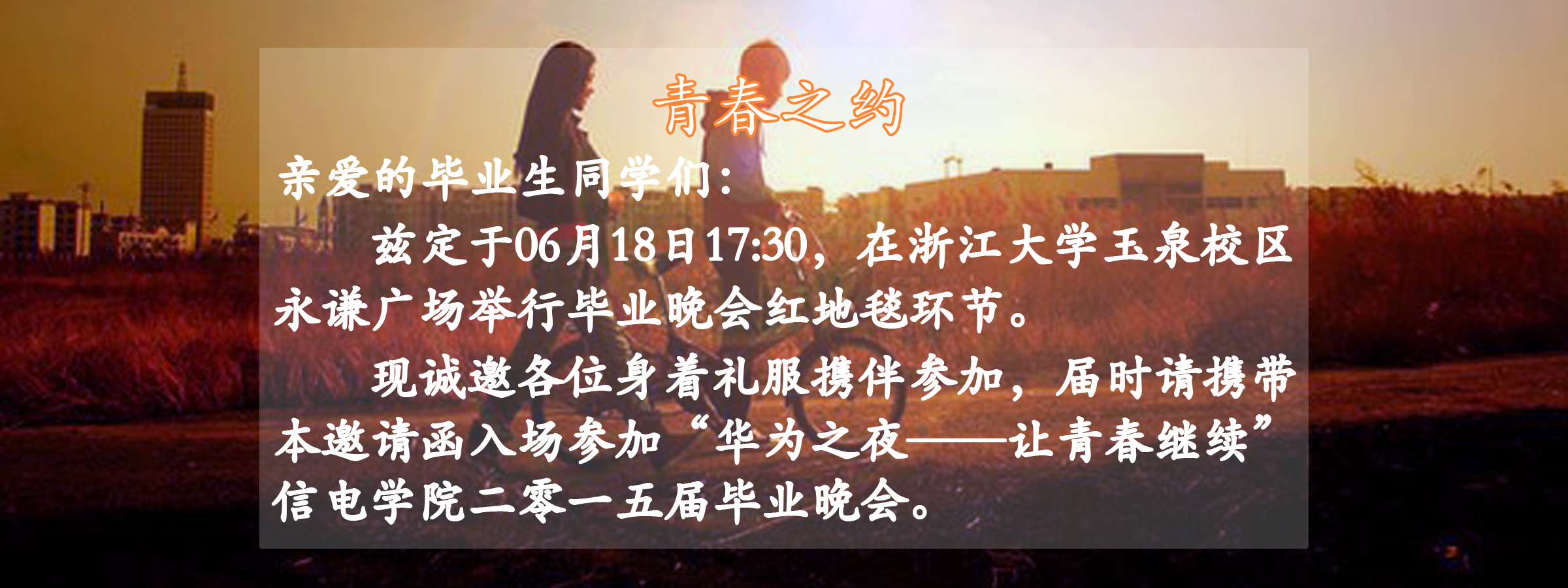 “华为之夜——让青春继续”信电学院2015毕业晚会将于2015年6月18日晚上18:00在玉泉校区永谦剧场上演,师生观众凭入场券进场,毕业生评邀请函走红地毯并签名、佩戴毕业徽章!