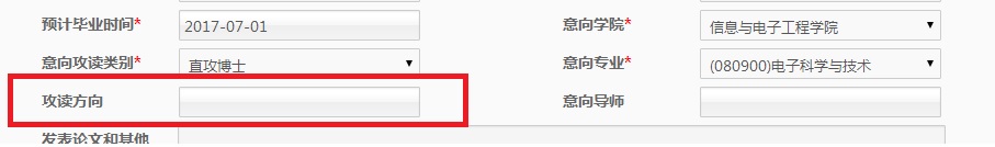 特别注意:网上填写“浙江大学2016年夏令营申请”时请务必在“攻读方向”栏(如下图所示)中明确填写“电子工程系”、“微电子学院微纳电子研究所方向”、“微电子学院超大规模集成电路设计研究所方向”,每人只能申报一个方向,便于后续审核和选拔。因未填写攻读方向而未能入选者,后果由申请人自行承担。