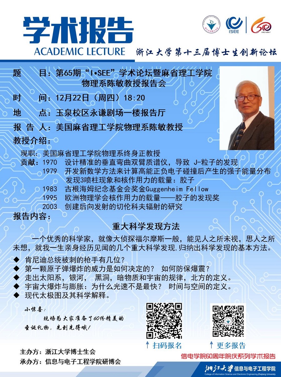 关于举办浙江大学第十三届博士生创新论坛——信电分论坛之“第65期“I•SEE”学术论坛暨麻省理工学院物理系陈敏教授报告会”的通知