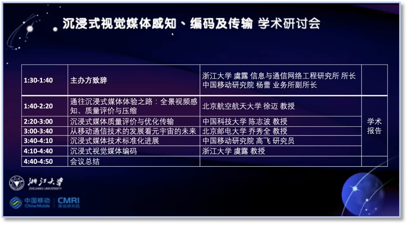 为促进元宇宙时代沉浸式视觉媒体技术的发展,由浙江大学信息与通信网络工程研究所(信通所)和中国移动研究院业务所(业务所)主办的“元宇宙时代的沉浸式视觉媒体感知、编码及传输”学术研讨会于2022年6月28日顺利召开。会议的特邀专家从感知与质量评价、高效编码与优化传输、移动通信技术发展及标准化进展等多维度介绍了沉浸式视觉媒体相关的最新研究状况,梳理了元宇宙应用对于沉浸式媒体技术的挑战与机遇。线上线下参与人数达160余人。
