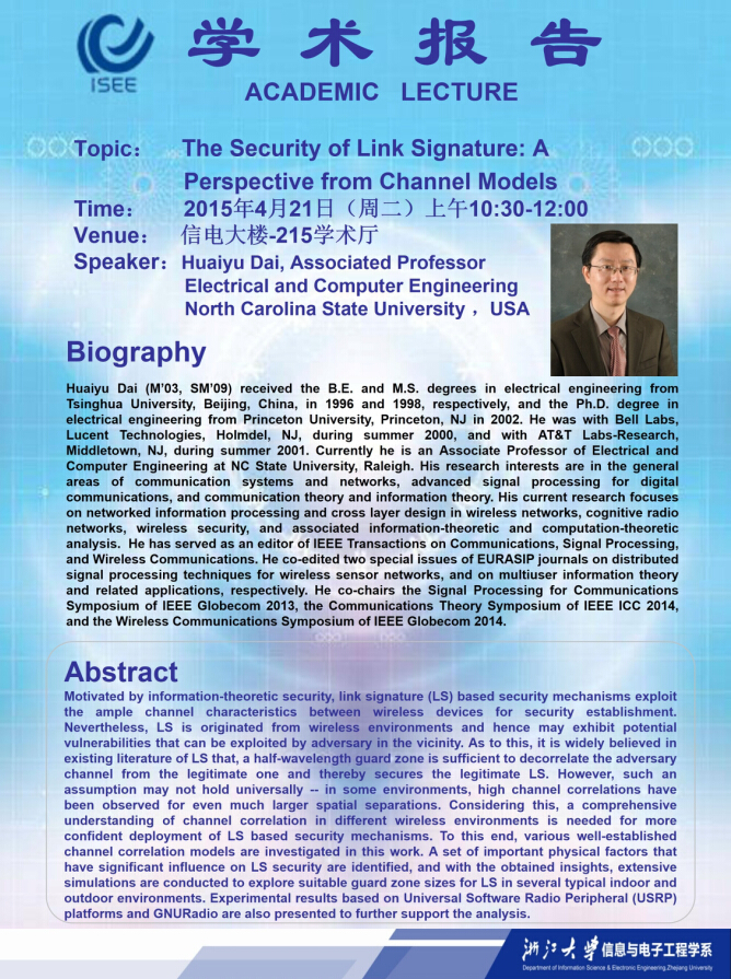 关于美国北卡罗莱纳州立大学戴怀宇教授学术报告的通知(一)