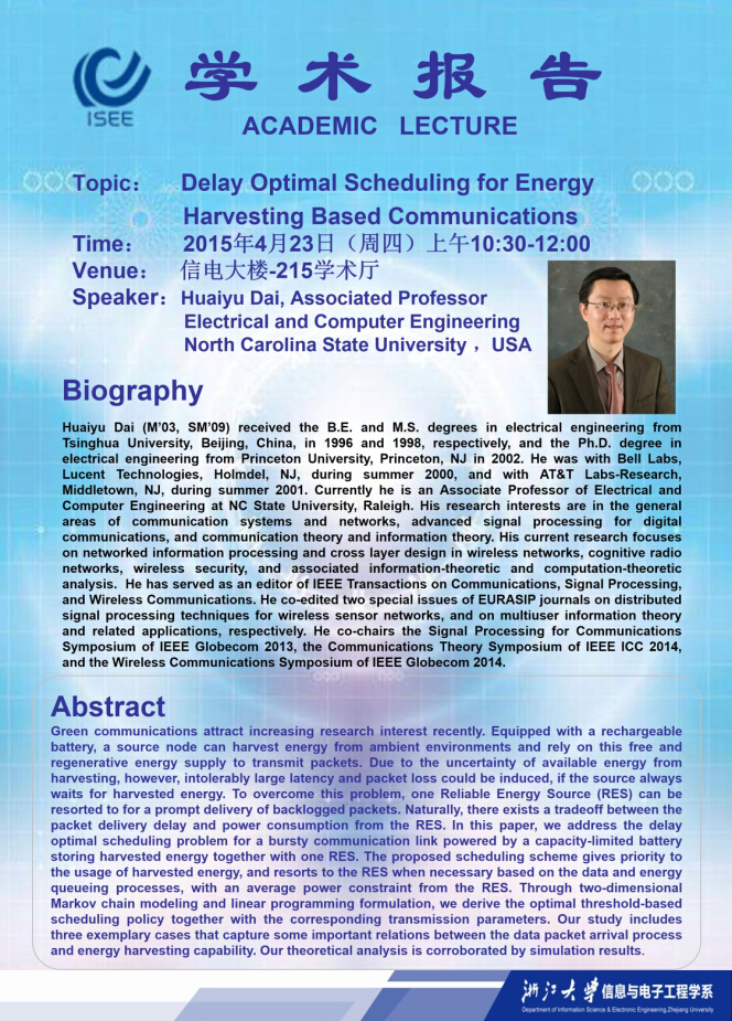 关于美国北卡罗莱纳州立大学戴怀宇教授学术报告的通知(三)