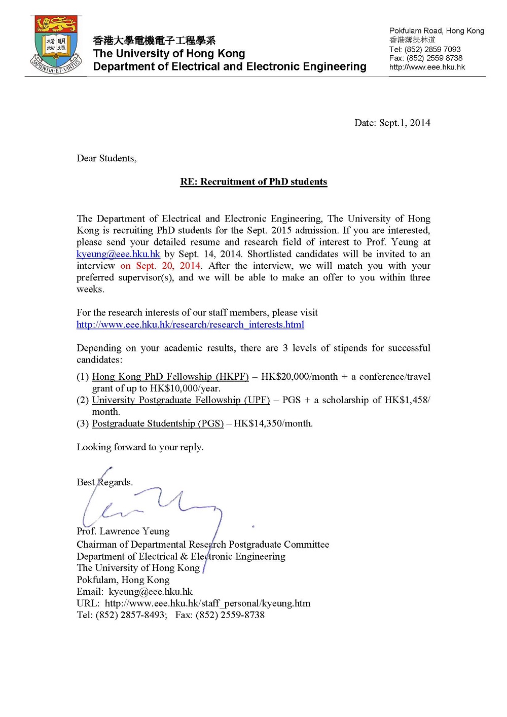 香港大学电机电子工程系博士生招生通知