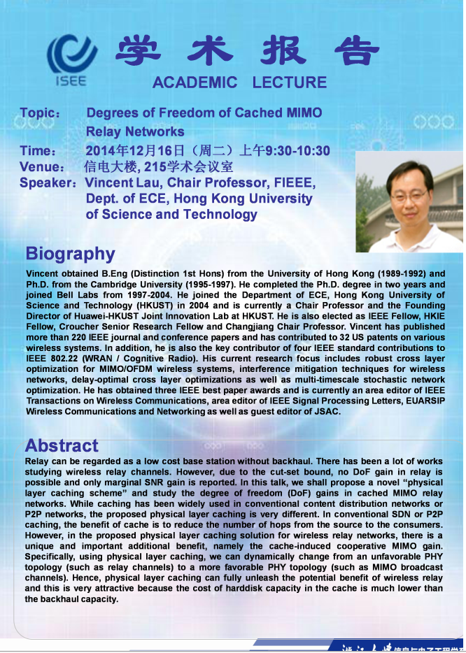 关于香港科技大学Vincent Lau教授学术报告的通知