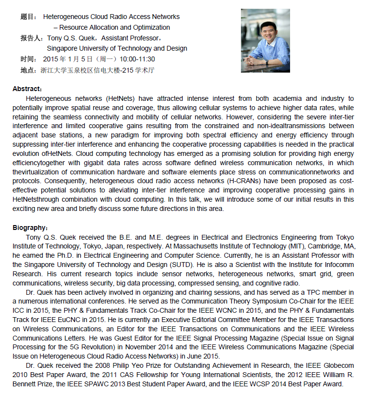 关于新加坡科技设计大学(SUTD)Tony Quek教授学术报告的通知