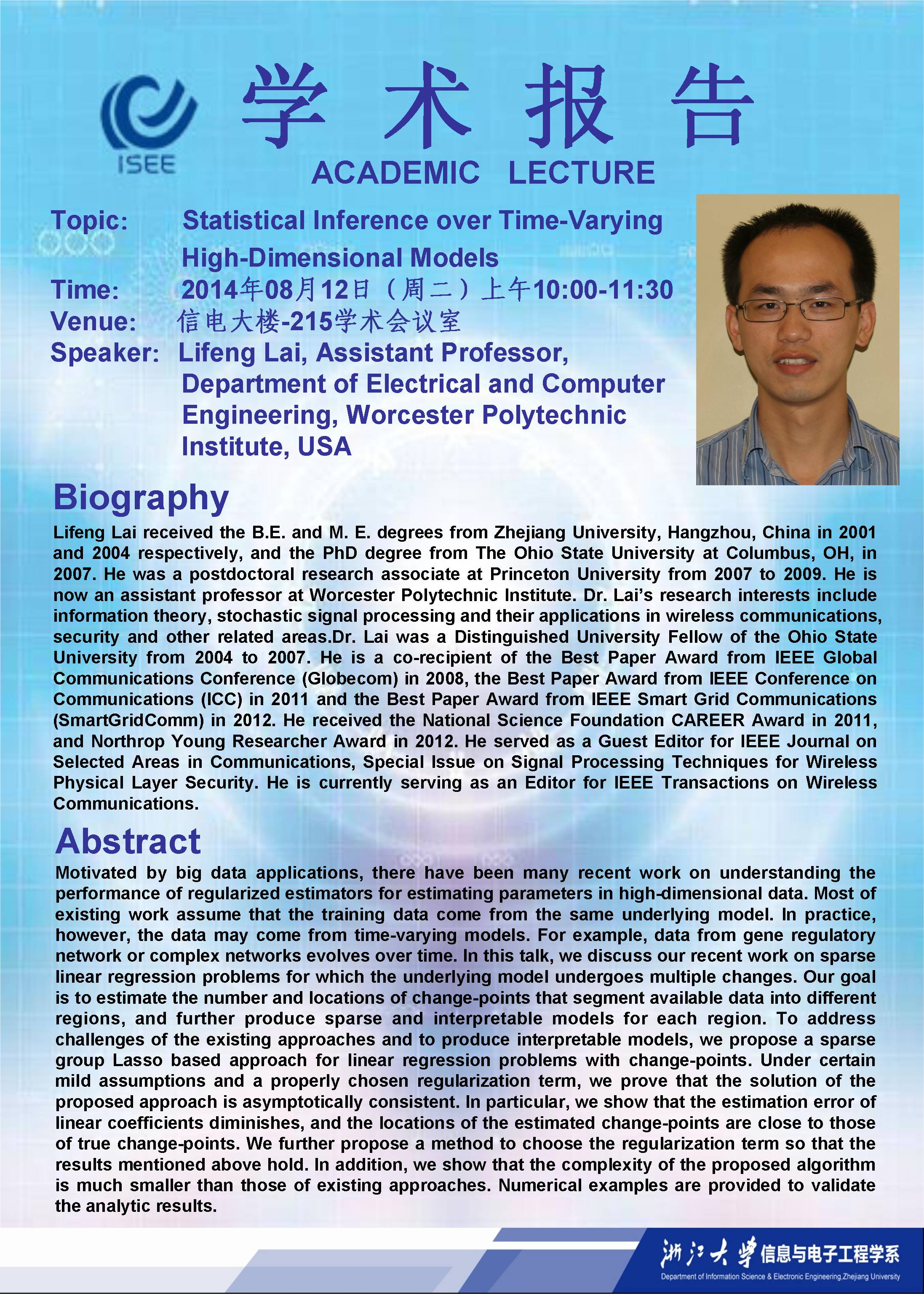 关于美国伍斯特理工学院Lifeng Lai博士学术报告的通知