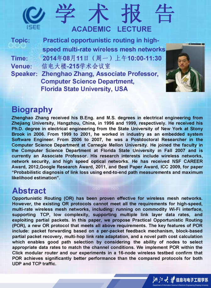 关于美国佛罗里达州立大学Zhenghao Zhang博士学术报告的通知