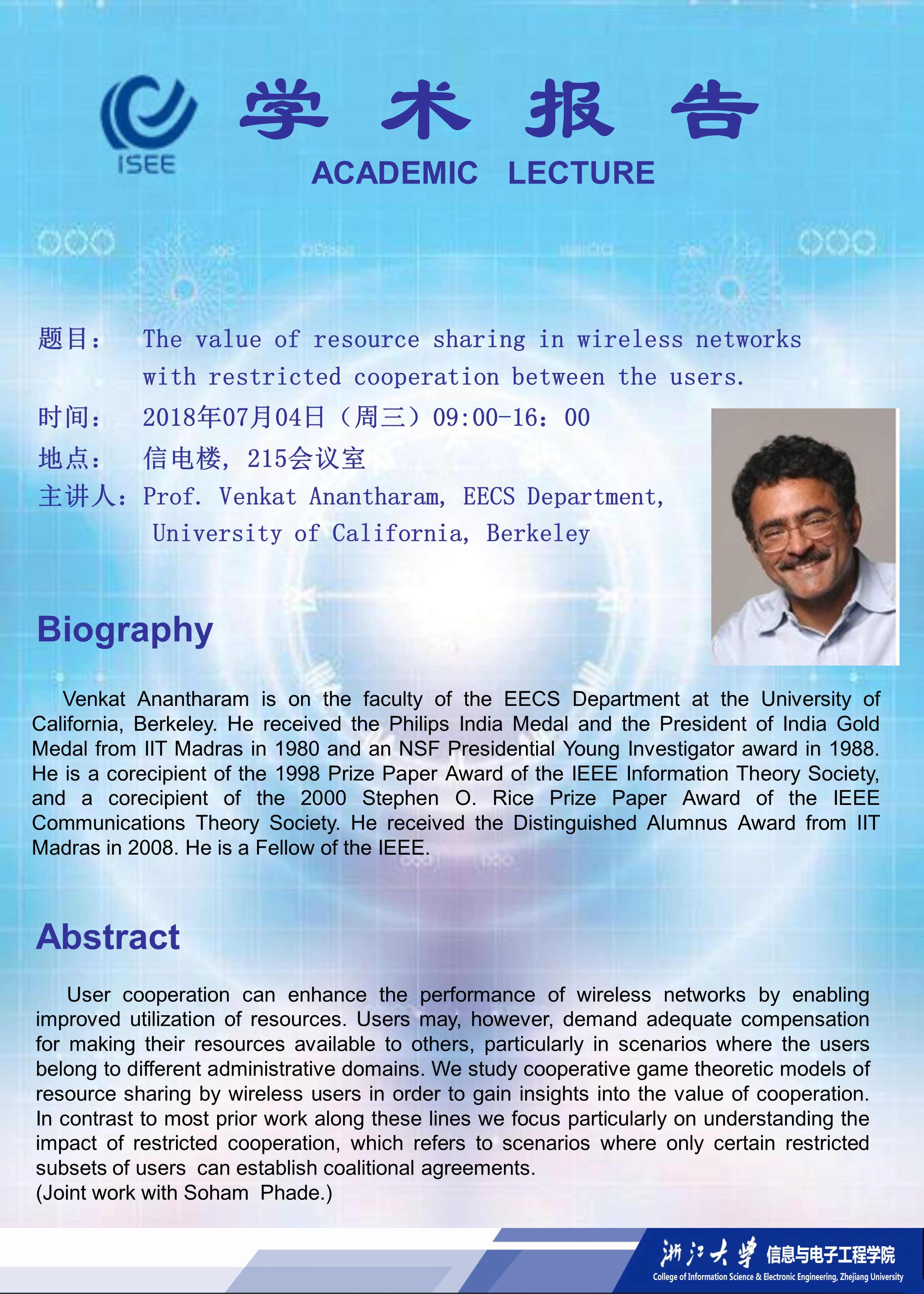关于美国加州大学伯克利分校 Prof. Venkat Anantharam学术报告的通知