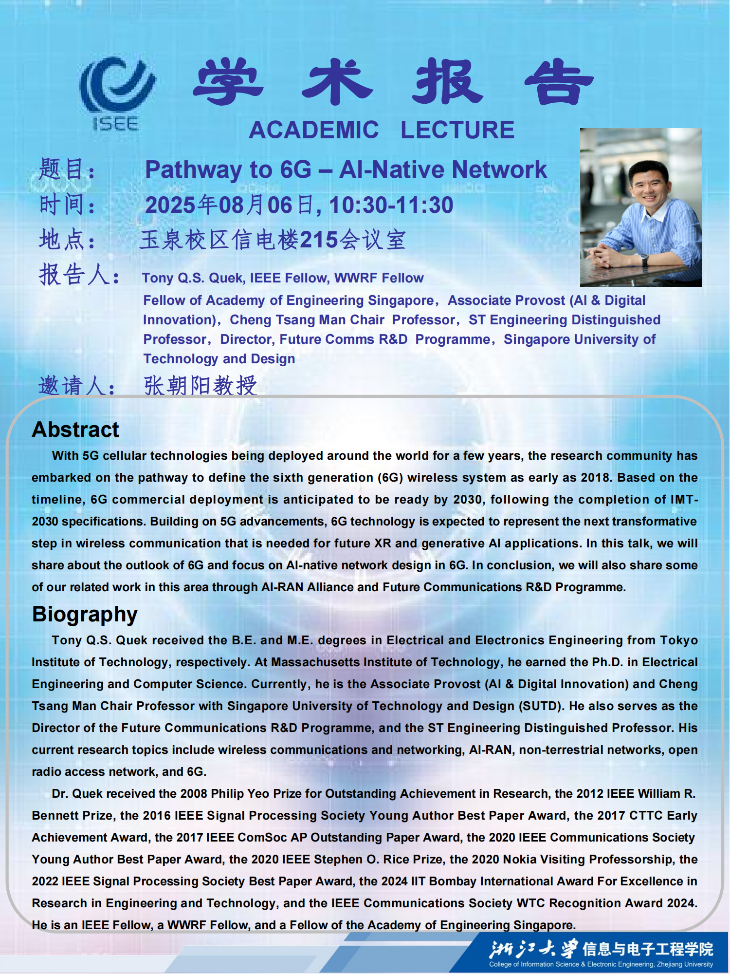 关于新加坡SUTD Tony Q.S. Quek教授学术报告的通知